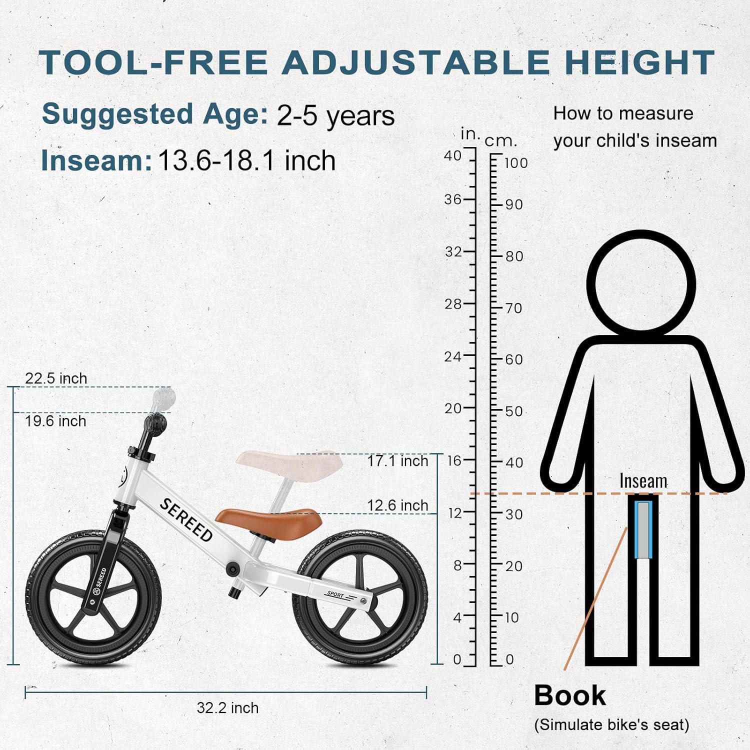 - STURDY AND SAFE- What you think for your kids is what SEREED toddler balance bike have. Wide and tough carbon steel frame, supports up to 110 lbs, safe footrest pad, rubber grips, soft saddle and a 12.6 inch starting seat height, let your little one enjoy cycling at an early age!
